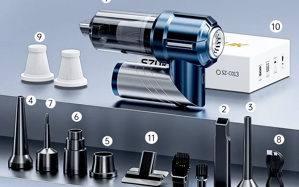 2.5 Accessories Brush, flat tube, large nozzle, USB charging cable, (three inflatable accessories), long rod, long rod brush(optional: HEPA, simple open cover dust cup, bag)
